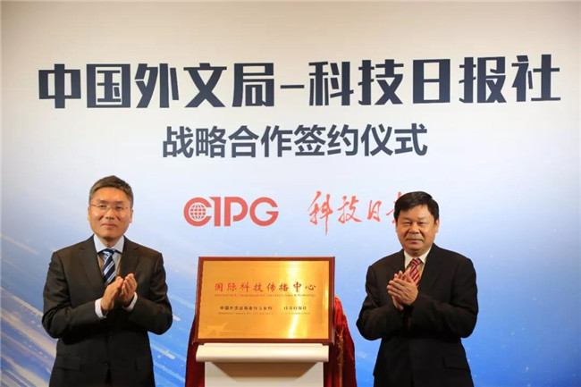 ▲中國外文局與科技日報社聯(lián)合工作機構(gòu)——國際科技傳播中心正式揭牌成立。