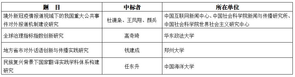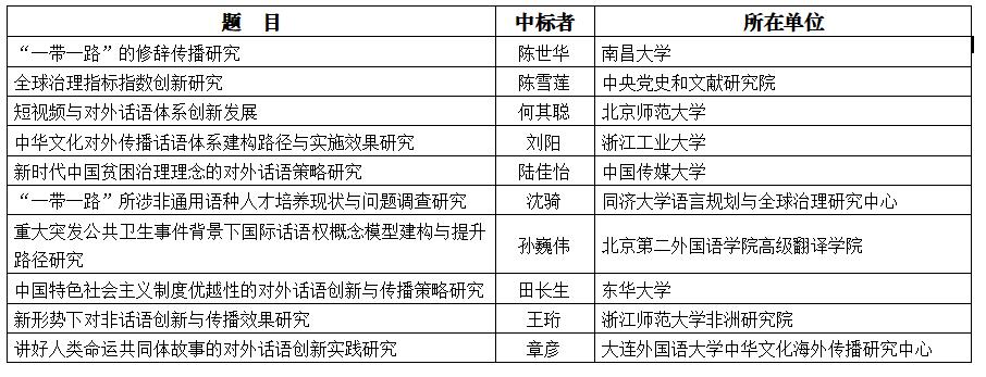 2020年度中國外文局對外話語體系建設(shè)課題研究項目招標(biāo)工作現(xiàn)已結(jié)束,評審委員會已完成全部評審工作,現(xiàn)將課題中標(biāo)結(jié)果公示如下(以姓氏拼音為序),公示期為2020年3月25日至4月1日。