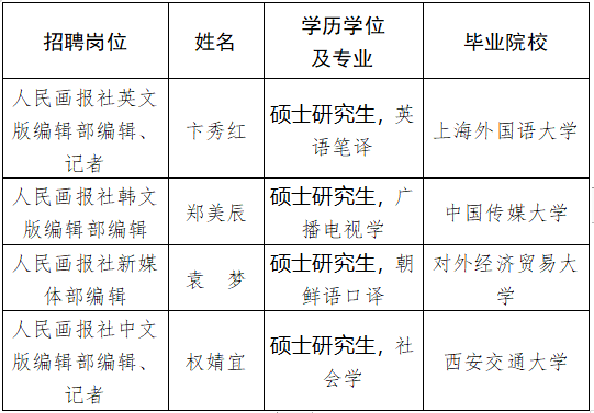 根據(jù)事業(yè)單位公開招聘工作有關(guān)規(guī)定和《中國外文局所屬企事業(yè)單位2020年度公開招聘工作人員簡章》,現(xiàn)將中國外文局所屬人民畫報社2020年度擬聘用事業(yè)單位工作人員予以公示。公示期間,如有問題,請向中國外文局反映。
