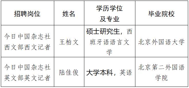 中國(guó)外文局所屬今日中國(guó)雜志社2020年公開(kāi)招聘擬聘用人員公示