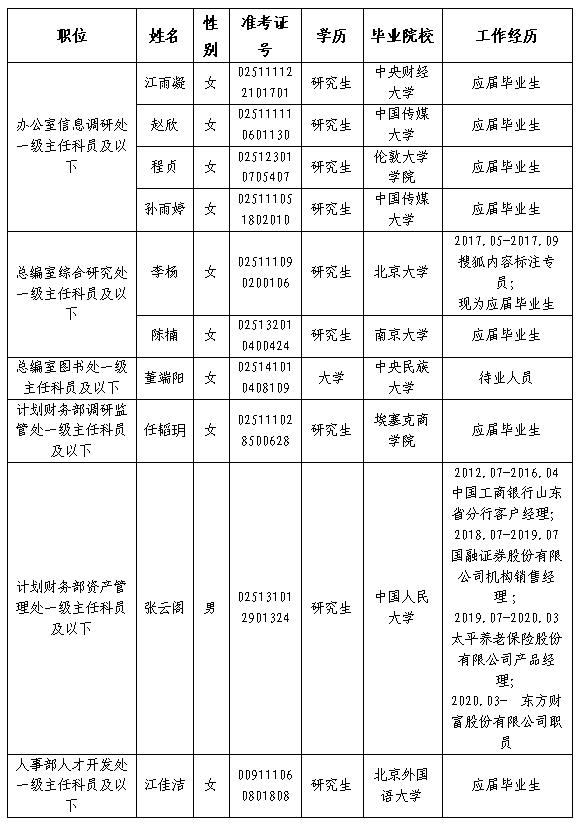 根據(jù)中央機關(guān)及其直屬機構(gòu)2020年度考試錄用公務(wù)員工作有關(guān)要求,經(jīng)過筆試、面試、考察、體檢等程序,擬錄用江雨凝等10名同志為中國外文局機關(guān)工作人員,現(xiàn)予以公示。公示期間,如有問題,請向中國外文局人事部反映。