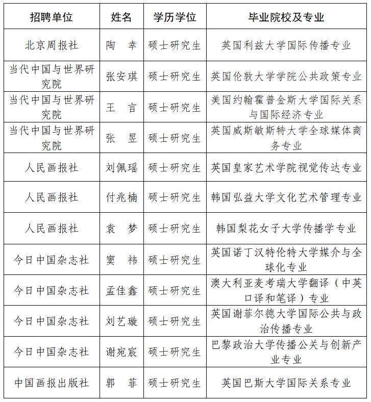 根據(jù)有關(guān)規(guī)定和《中國外文出版發(fā)行事業(yè)局所屬企事業(yè)單位2020年海外留學(xué)生招聘簡章》,現(xiàn)將中國外文局北京周報(bào)社、當(dāng)代中國與世界研究院、人民畫報(bào)社、今日中國雜志社、中國畫報(bào)出版社2020年度擬接收海外留學(xué)生予以公示。公示期間,如有問題,請向中國外文局反映。