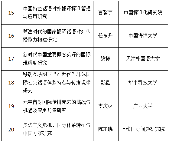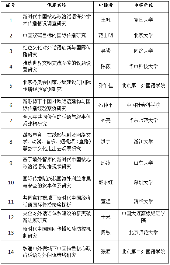 為貫徹落實習(xí)近平總書記關(guān)于加強和改進我國國際傳播能力建設(shè)的重要講話精神,拓展研究領(lǐng)域范疇,廣泛匯聚各方力量,“中國外文局對外話語體系研究協(xié)調(diào)機制”自本年度起更名為“中國外文局國際傳播能力建設(shè)研究協(xié)調(diào)機制”。目前,該機制2022年度課題招標(biāo)工作已結(jié)束,中國外文局委托當(dāng)代中國與世界研究院完成全部評審工作,現(xiàn)將中標(biāo)結(jié)果公示如下。