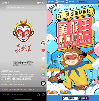 5月30日,朝華出版社“美猴王”賬號入駐抖音平臺,引起廣大網(wǎng)友熱烈關(guān)注,24小時內(nèi)“美猴王”首條視頻穩(wěn)居抖音熱榜前列,話題熱度高達(dá)6000多萬,視頻播放量達(dá)200多萬。目前粉絲8.3萬,獲點贊6.8萬,有10多家公司私信洽商合作。抖音平臺在兒童節(jié)當(dāng)天以開屏廣告形式為賬號推流。
