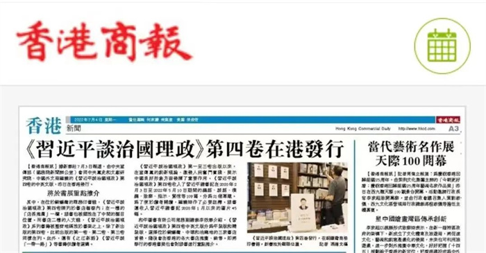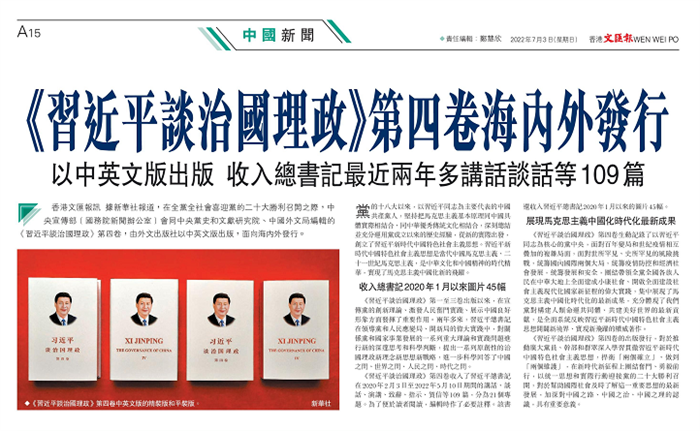 7月3日,由中央宣傳部(國務(wù)院新聞辦公室)會同中央黨史和文獻(xiàn)研究院、中國外文局編輯的《習(xí)近平談治國理政》第四卷中英文版在香港發(fā)行。