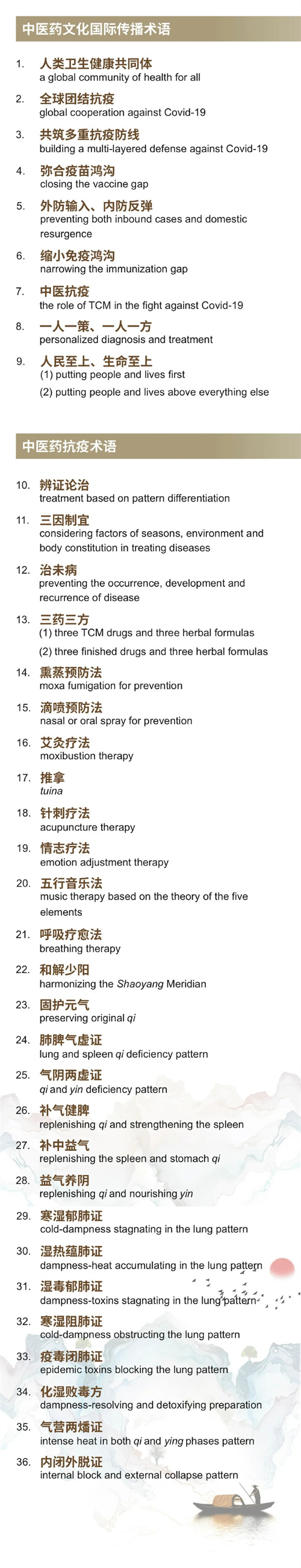中國外文局翻譯院負責人介紹,此次發(fā)布的36條術語,既包括“人類衛(wèi)生健康共同體”“人民至上、生命至上”等來自中醫(yī)藥文化國際傳播工作中的常用術語,也有“辨證論治”“三藥三方”等來自中醫(yī)藥抗疫過程中的常用術語。36條術語均提供了最大程度忠實于中文本意,同時又便于國外受眾理解的英文翻譯,其中個別條目提供了兩種英文譯法。