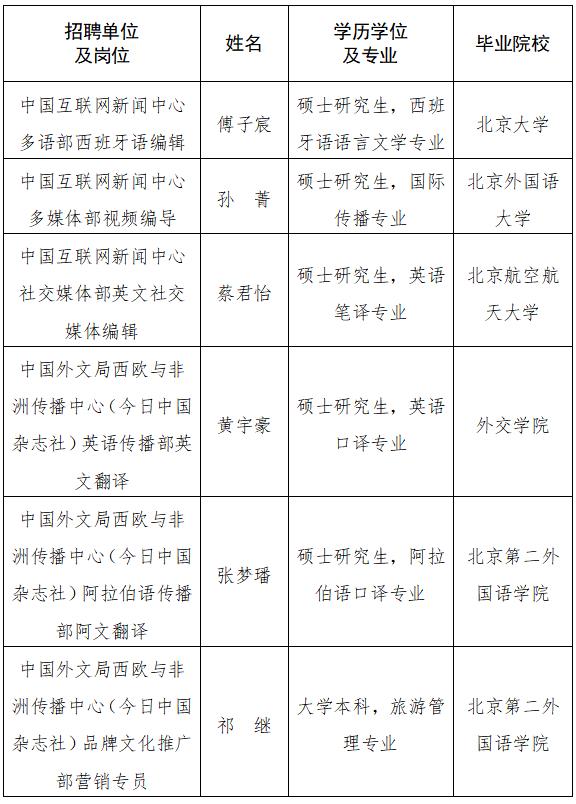 根據(jù)事業(yè)單位公開招聘工作有關(guān)規(guī)定和《中國外文局所屬企事業(yè)單位2022年度公開招聘工作人員公告》,現(xiàn)將中國外文局所屬中國互聯(lián)網(wǎng)新聞中心、中國外文局西歐與非洲傳播中心(今日中國雜志社)2022年度擬聘用事業(yè)單位工作人員予以公示。公示期間,如有問題,請向外文局反映。