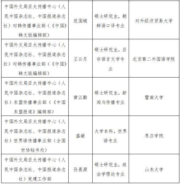 根據(jù)事業(yè)單位公開招聘工作有關(guān)規(guī)定和《中國外文局所屬企事業(yè)單位2022年度公開招聘工作人員公告》,現(xiàn)將中國外文局所屬當(dāng)代中國與世界研究院、中國對外書刊出版發(fā)行中心、中國外文局亞太傳播中心(人民中國雜志社、中國報道雜志社)2022年度擬聘用事業(yè)單位工作人員予以公示。公示期間,如有問題,請向中國外文局反映。