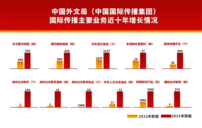 9月27日,“奮進(jìn)新時(shí)代”主題成就展在京開幕。在該展覽的中央綜合展區(qū),展出了一幅中國(guó)外文局國(guó)際傳播主要業(yè)務(wù)近十年增長(zhǎng)情況圖表,通過(guò)11組業(yè)務(wù)發(fā)展數(shù)據(jù)的對(duì)比,充分體現(xiàn)了黨的十八大以來(lái),中國(guó)外文局以習(xí)近平新時(shí)代中國(guó)特色社會(huì)主義思想為指導(dǎo),建設(shè)世界一流、具有強(qiáng)大綜合實(shí)力的國(guó)際傳播機(jī)構(gòu)取得的突破性進(jìn)展。