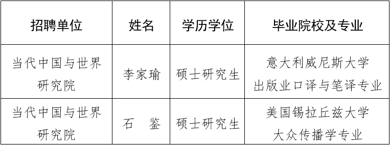 根據(jù)有關(guān)規(guī)定和《中國外文局所屬企事業(yè)單位2022年海外留學(xué)生招聘公告》,現(xiàn)將中國外文局當代中國與世界研究院2022年度擬接收海外留學(xué)生予以公示。公示期間,如有問題,請向中國外文局反映。