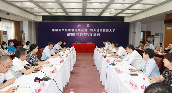 7月10日,中國(guó)外文局與對(duì)外經(jīng)濟(jì)貿(mào)易大學(xué)戰(zhàn)略合作協(xié)議簽約儀式在對(duì)外經(jīng)貿(mào)大學(xué)舉行。中國(guó)外文局局長(zhǎng)杜占元,副局長(zhǎng)劉大為,對(duì)外經(jīng)貿(mào)大學(xué)黨委書(shū)記黃寶印,對(duì)外經(jīng)貿(mào)大學(xué)校長(zhǎng)、黨委副書(shū)記趙忠秀,對(duì)外經(jīng)貿(mào)大學(xué)黨委副書(shū)記文君,對(duì)外經(jīng)貿(mào)大學(xué)副校長(zhǎng)王敬波出席簽約儀式。