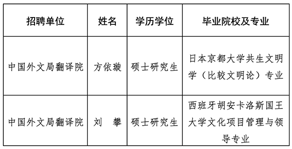 根據(jù)有關(guān)規(guī)定和《中國外文出版發(fā)行事業(yè)局所屬企事業(yè)單位2023年海外留學(xué)生招聘公告》,現(xiàn)將中國外文出版發(fā)行事業(yè)局所屬中國外文局翻譯院2023年度擬接收海外留學(xué)生予以公示。公示期間,如有問題,請向中國外文局人事部反映。