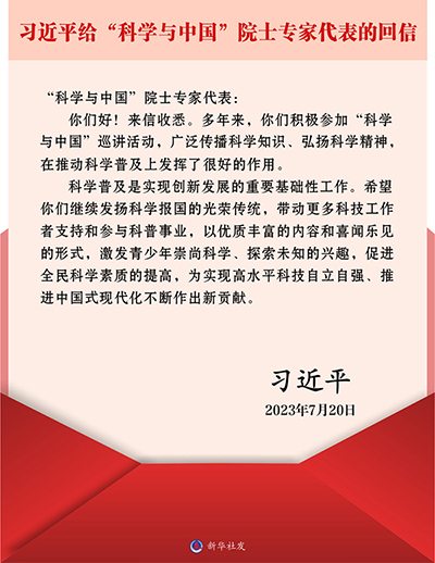 習(xí)近平在回信中說,多年來,你們積極參加“科學(xué)與中國”巡講活動,廣泛傳播科學(xué)知識、弘揚科學(xué)精神,在推動科學(xué)普及上發(fā)揮了很好的作用。