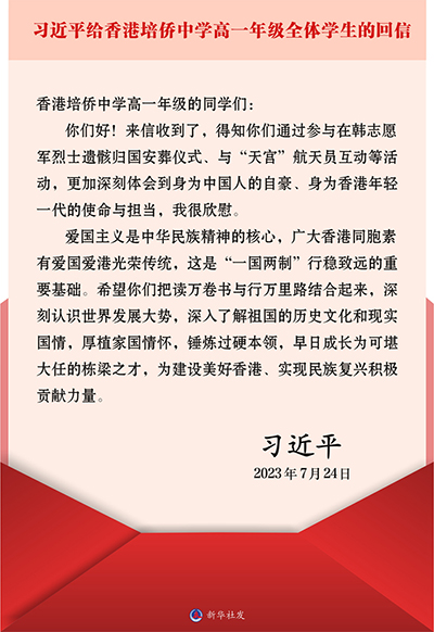 國(guó)家主席習(xí)近平7月24日給香港培僑中學(xué)高一年級(jí)全體學(xué)生回信,對(duì)他們予以親切勉勵(lì)。