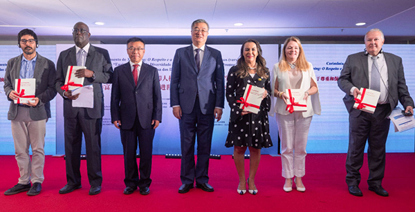 中國外文局副局長劉大為、里約熱內(nèi)盧州議會副議長蒂婭·茹、中國駐巴西大使祝青橋和里約熱內(nèi)盧市議員埃德森·桑托斯出席首發(fā)式并致辭,中國駐里約熱內(nèi)盧總領(lǐng)事田敏出席活動。來自巴方政界、學(xué)術(shù)界、文化界等各界代表約100人參加了活動。