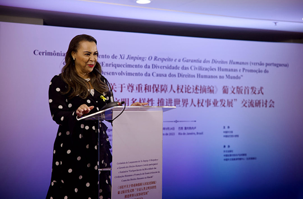 蒂婭·茹說,巴中嘉賓共同見證了一部重要著作的首發(fā),著作中習(xí)近平主席關(guān)于人權(quán)的重要論述將幫助國外讀者更好理解中國人權(quán)事業(yè)的發(fā)展,也引發(fā)讀者對未來如何進(jìn)一步推動世界人權(quán)事業(yè)發(fā)展進(jìn)行思考。中國人權(quán)事業(yè)發(fā)展緊密地結(jié)合著中國的現(xiàn)實(shí),提高億萬中國人民的生活水平,是中國共產(chǎn)黨和中國政府最關(guān)心的議題。民生改善、教育健康事業(yè)發(fā)展和生態(tài)文明建設(shè)等,都是中國尊重人權(quán)、發(fā)展人權(quán)的實(shí)際體現(xiàn)。人權(quán)事業(yè)發(fā)展是一個(gè)全球化的議題,巴西應(yīng)進(jìn)一步加強(qiáng)同中國的人權(quán)發(fā)展合作,通過持續(xù)的努力,參與和推動全球人權(quán)治理。