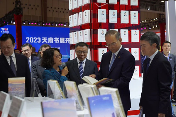 10月13日至16日,2023天府書展在四川成都舉行。開幕當(dāng)天,四川省委副書記、省長(zhǎng)黃強(qiáng),新聞出版總署原署長(zhǎng)柳斌杰,中國(guó)出版協(xié)會(huì)理事長(zhǎng)、國(guó)家新聞出版廣電總局原副局長(zhǎng)鄔書林及中宣部有關(guān)部門負(fù)責(zé)人到中國(guó)外文局展區(qū)巡館,了解中國(guó)外文局翻譯出版與對(duì)外宣介習(xí)近平總書記重要著作的相關(guān)情況,翻閱“絲路百城傳”“讀懂中國(guó)”等重點(diǎn)品牌系列圖書,并具體了解中國(guó)外文局在中華文化與文明、中國(guó)式現(xiàn)代化、“一帶一路”等重大主題對(duì)外出版方面的工作成果。中國(guó)外文局副局長(zhǎng)劉大為陪同。
