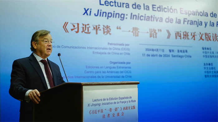 當(dāng)?shù)貢r(shí)間4月11日上午,由中國(guó)外文局、中國(guó)駐智利大使館指導(dǎo),外文出版社、中國(guó)外文局美洲傳播中心(北京周報(bào)社)、智利大學(xué)國(guó)際關(guān)系學(xué)院主辦的《習(xí)近平談“一帶一路”》西班牙文版讀者交流會(huì)在智利首都圣地亞哥舉行。