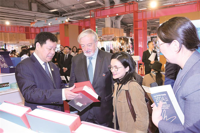 在2024法國巴黎國際博覽會“遇鑒中國”中華文化主題展,杜占元(左一)向國外嘉賓介紹中華文化產(chǎn)品。
