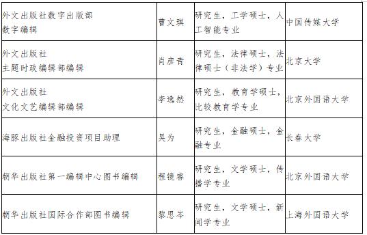 根據(jù)公開招聘工作有關(guān)規(guī)定和《中國外文局所屬企事業(yè)單位2024年度公開招聘工作人員公告》,現(xiàn)將中國外文局所屬當(dāng)代中國與世界研究院、中國外文局亞太傳播中心(人民中國雜志社、中國報道雜志社)、外文出版社有限責(zé)任公司、海豚出版社有限責(zé)任公司、朝華出版社有限責(zé)任公司等5家單位2024年度擬聘用工作人員予以公示。公示期間,如有問題,請向中國外文局反映。