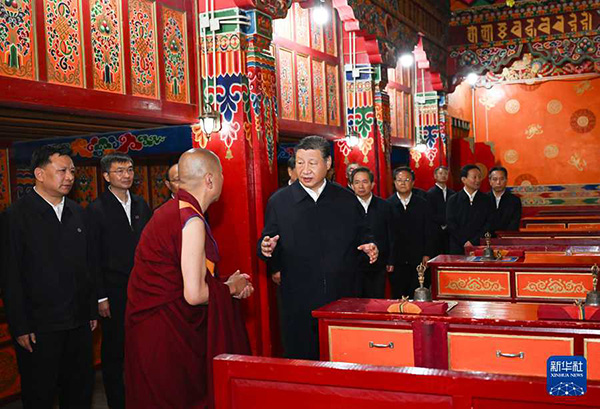 6月18日至19日,中共中央總書記、國家主席、中央軍委主席習(xí)近平在青??疾臁_@是18日下午,習(xí)近平在位于西寧市城中區(qū)的宏覺寺考察。(新華社記者 謝環(huán)馳 攝)