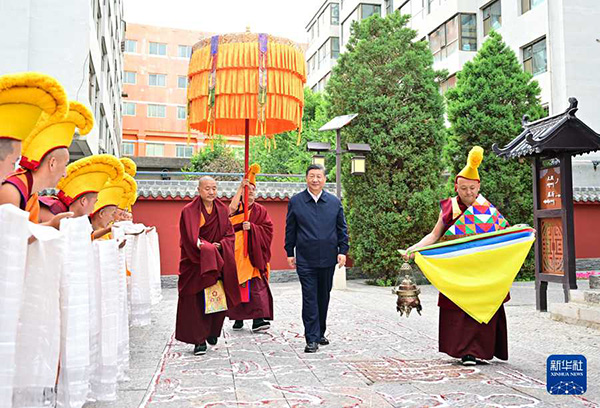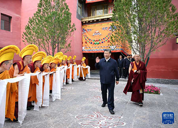 6月18日至19日,中共中央總書記、國家主席、中央軍委主席習(xí)近平在青??疾?。這是18日下午,習(xí)近平在位于西寧市城中區(qū)的宏覺寺考察。(新華社記者 翟健嵐 攝)