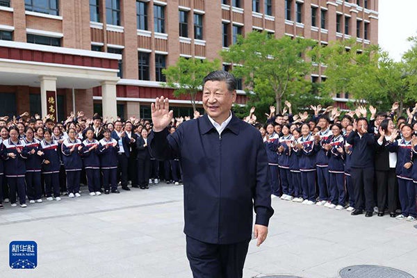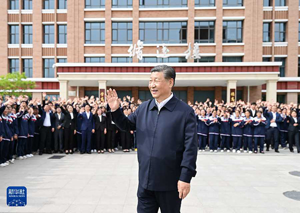 6月18日至19日,中共中央總書記、國家主席、中央軍委主席習(xí)近平在青??疾?。這是18日下午,習(xí)近平在果洛西寧民族中學(xué)考察時(shí),向師生們揮手致意。(新華社記者 謝環(huán)馳 攝)