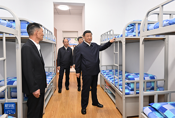 6月18日至19日,中共中央總書記、國家主席、中央軍委主席習(xí)近平在青??疾?。這是18日下午,習(xí)近平在果洛西寧民族中學(xué)宿舍樓察看學(xué)生住宿條件。(新華社記者 岳月偉 攝)
