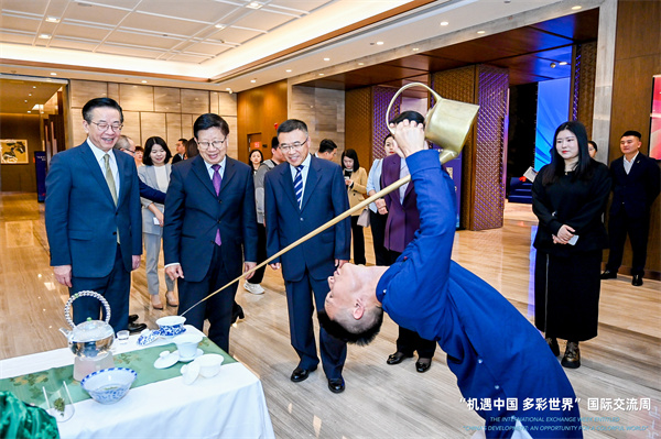 活動上,貴州省委常委、省委宣傳部部長盧雍政,中國外文局副局長劉大為,格林納達(dá)駐華大使馬巖,中共中央黨校原副校長、中國國家創(chuàng)新與發(fā)展戰(zhàn)略研究會學(xué)術(shù)委員會常務(wù)副主席、第十一屆全國政協(xié)常委李君如,遵義市人大常委會主任何薇,貴州省外事辦副主任羅煜,中國外文局煦方國際傳媒總經(jīng)理王新玲,遵義市委常委、市委宣傳部部長鄧航,中歐論壇創(chuàng)始人、中歐美全球倡議發(fā)起人高大偉共同敲響寓意中外和鳴的銅鼓,標(biāo)志著“機遇中國 多彩世界”國際交流周正式啟動。