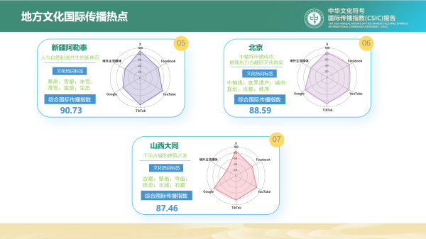 此外,報(bào)告列舉了2024年在國(guó)際上有影響力的地方文化國(guó)際傳播七個(gè)熱點(diǎn),分別是:“China Travel”的最前線(上海)、用冰雪熱情感染全球(黑龍江哈爾濱)、“麻辣味道”香飄海外(甘肅天水)、蟳埔簪花綻放海外風(fēng)采(福建泉州)、人與自然和諧共生的新典范(新疆阿勒泰)、中軸線申遺成功展現(xiàn)東方古都的文化脊梁(北京)以及千年古城的建筑之美(山西大同)。