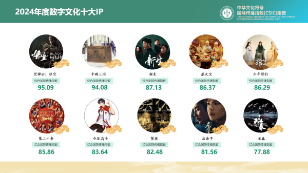 在綜合考慮文化傳播深度、文化創(chuàng)新性與適應(yīng)性、文化影響力、受眾反饋等因素的基礎(chǔ)上,結(jié)合國(guó)際傳播指數(shù)模型,報(bào)告提煉出“2024年度數(shù)字文化十大IP”,依次為《黑神話:悟空》《卡游三國(guó)》《新生》《落凡塵》《少年歌行》《第二十條》《全職高手》《繁花》《慶余年》和《詠春》,涵蓋電影、電視劇、游戲、潮玩、網(wǎng)文、動(dòng)漫、舞劇等多種數(shù)字文化傳播載體。