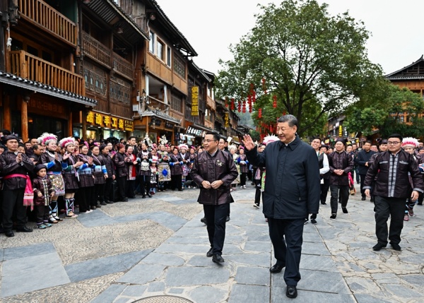 17日下午,習(xí)近平來到黔東南州黎平縣肇興侗寨考察。寨門口,身著民族盛裝的村民唱起侗族大歌歡迎總書記。習(xí)近平饒有興致地聽取侗族大歌的藝術(shù)起源、曲調(diào)特點、演唱形式等方面介紹。隨后,沿著村寨路道察看侗寨風(fēng)貌和旅游商鋪,不時駐足與店主、游客、村民互動交談。在侗族文化展示中心,他詳細(xì)了解侗族歷史、風(fēng)俗和服飾、建筑等特色文化保護(hù)傳承情況。在侗鄉(xiāng)特色產(chǎn)業(yè)基地,他觀看蠟染工藝流程,對蠟染合作社堅持顧客至上、質(zhì)量第一的運營理念給予肯定。習(xí)近平指出,少數(shù)民族文化是中華文化不可或缺的組成部分,既要保護(hù)有形的村落、民居、特色建筑風(fēng)貌,傳承無形的非物質(zhì)文化遺產(chǎn),又要推動其創(chuàng)造性轉(zhuǎn)化、創(chuàng)新性發(fā)展,讓民族特色在利用中更加鮮亮,不斷煥發(fā)新的光彩。