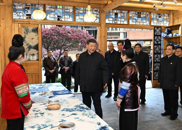3月17日至18日,中共中央總書記、國家主席、中央軍委主席習(xí)近平在貴州考察。這是17日下午,習(xí)近平在黔東南州黎平縣肇興侗寨侗鄉(xiāng)特色產(chǎn)業(yè)基地考察。(新華社記者 謝環(huán)馳 攝)
