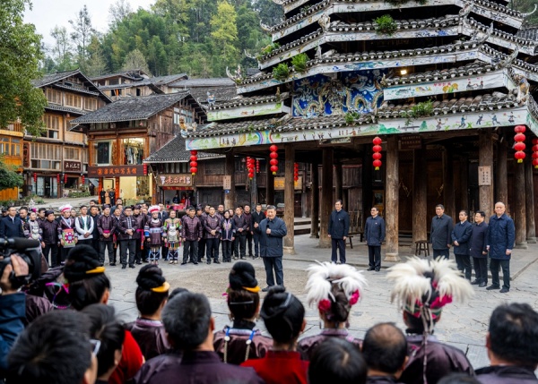 3月17日至18日,中共中央總書記、國家主席、中央軍委主席習(xí)近平在貴州考察。這是17日下午,習(xí)近平在黔東南州黎平縣肇興侗寨考察時,在寨門口向身著民族盛裝歡迎的村民揮手致意。(新華社記者 燕雁 攝)