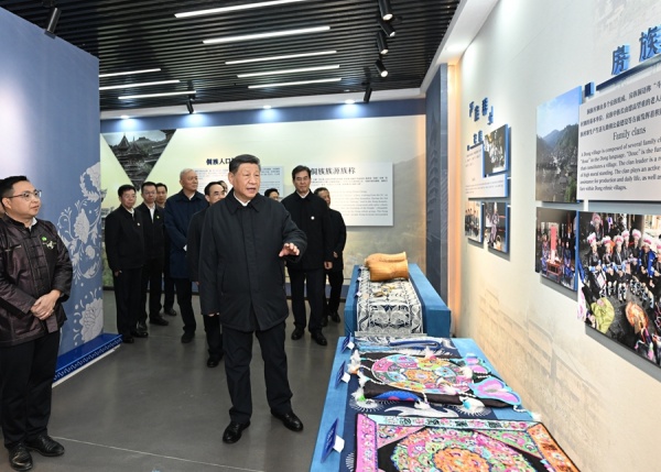 3月17日至18日,中共中央總書記、國家主席、中央軍委主席習(xí)近平在貴州考察。這是17日下午,習(xí)近平在黔東南州黎平縣肇興侗寨侗族文化展示中心考察。(新華社記者 謝環(huán)馳 攝)