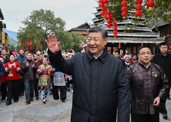 3月17日至18日,中共中央總書記、國家主席、中央軍委主席習(xí)近平在貴州考察。這是17日下午,習(xí)近平在黔東南州黎平縣肇興侗寨考察結(jié)束時,同鄉(xiāng)親們揮手道別。(新華社記者 燕雁 攝)