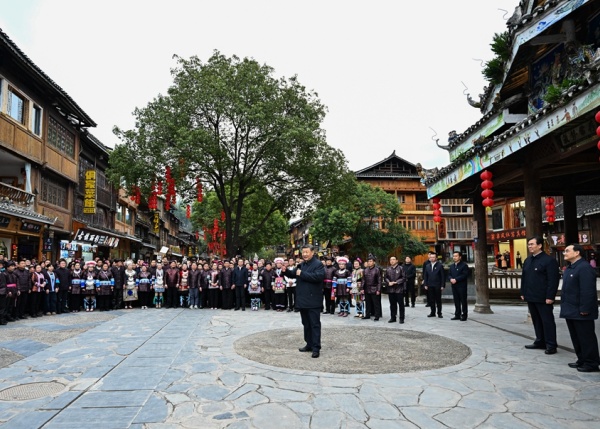 3月17日至18日,中共中央總書記、國家主席、中央軍委主席習(xí)近平在貴州考察。這是17日下午,習(xí)近平在黔東南州黎平縣肇興侗寨考察時,同村民們親切交流。(新華社記者 燕雁 攝)