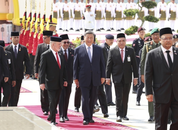 習近平乘車抵達時,易卜拉欣和馬來西亞總理安瓦爾在下車處熱情迎接。兩國元首登上檢閱臺,軍樂團奏中馬兩國國歌,鳴禮炮21響。習近平檢閱儀仗隊。兩國元首進入國家王宮大廳,同雙方陪同人員握手致意。