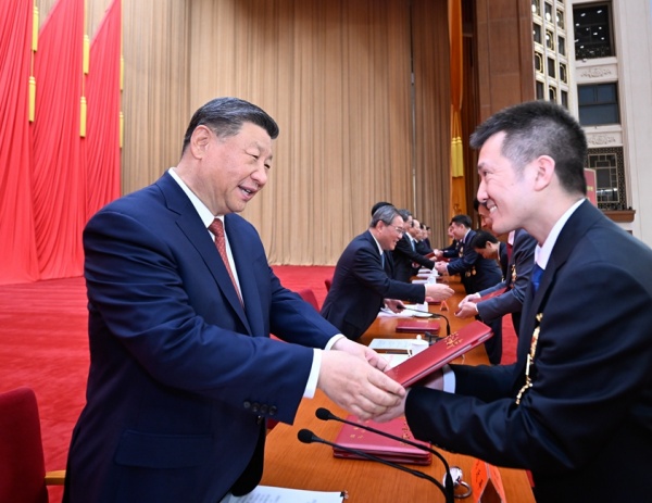 4月28日,慶祝中華全國(guó)總工會(huì)成立100周年暨全國(guó)勞動(dòng)模范和先進(jìn)工作者表彰大會(huì)在北京人民大會(huì)堂隆重舉行。這是習(xí)近平等黨和國(guó)家領(lǐng)導(dǎo)人為全國(guó)勞動(dòng)模范和先進(jìn)工作者代表頒發(fā)榮譽(yù)證書。(新華社記者 謝環(huán)馳 攝)
