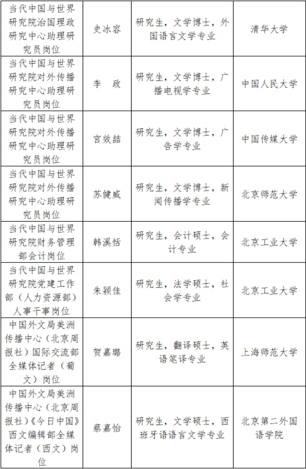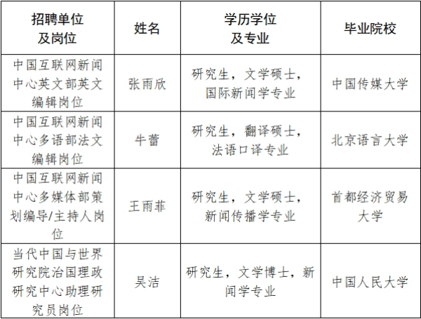 根據(jù)事業(yè)單位公開招聘工作有關(guān)規(guī)定和《中國外文出版發(fā)行事業(yè)局所屬企事業(yè)單位2025年度公開招聘工作人員公告》,現(xiàn)將我局所屬中國互聯(lián)網(wǎng)新聞中心、當(dāng)代中國與世界研究院、中國外文局美洲傳播中心(北京周報社)、中國外文局西歐與非洲傳播中心(今日中國雜志社)等4家單位2025年度擬聘用事業(yè)單位工作人員予以公示。公示期間,如有問題,請向我局反映。
