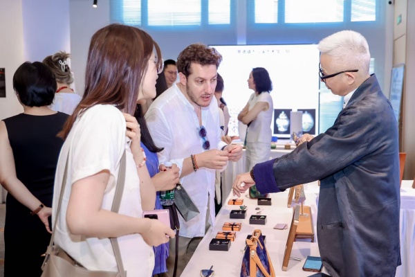 活動(dòng)現(xiàn)場(chǎng),今日中國(guó)澳門會(huì)客廳還專門設(shè)了小型非遺展覽,邀請(qǐng)了鐘家窯第四代傳承人、青花花鳥非遺傳承人鐘志偉,景德鎮(zhèn)市緣源陶瓷有限公司副總經(jīng)理王季平,武漢理工大學(xué)藝術(shù)與設(shè)計(jì)學(xué)院博士生導(dǎo)師、陶瓷藝術(shù)設(shè)計(jì)大師龔余輝,濮綢非遺傳承人代表戴金海,景泰藍(lán)工藝畫大師李偉平,紫禁城文化科技有限公司(阿聯(lián)酋)CEO楊苑分享了非遺傳承發(fā)展和對(duì)外交流的故事。