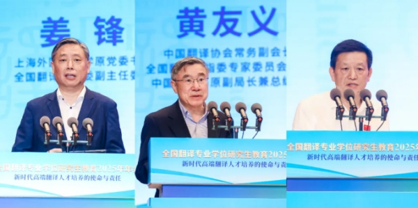 中國翻譯協(xié)會常務(wù)副會長、教指委專家委員會主任黃友義,上海外國語大學(xué)原黨委書記、教指委副主任委員姜鋒,湖南師范大學(xué)原黨委書記、教指委副主任委員蔣洪新作主旨發(fā)言。