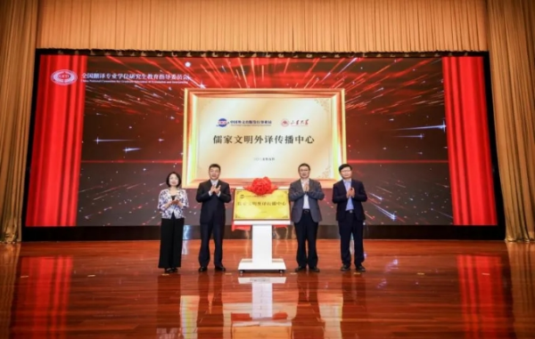會上還舉行了儒家文明外譯傳播中心揭牌儀式。中國外文局副局長、教指委主任委員于濤,山東大學(xué)常務(wù)副校長吳臻,中國翻譯研究院副院長、教指委委員楊平和山東大學(xué)外國語學(xué)院院長、翻譯學(xué)院院長馬文共同為儒家文明外譯傳播中心揭牌。