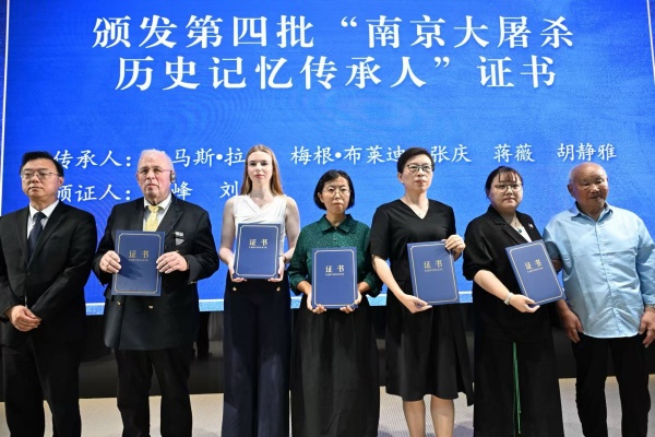 此次活動還宣布了第四批“南京大屠殺歷史記憶傳承人”名單,包括托馬斯·拉貝和梅根·布萊迪在內(nèi)的6位國際友人和“南京安全區(qū)”工作人員、幸存者以及歷史證物守護者的后代在列。周峰和南京大屠殺幸存者劉民生為他們頒發(fā)證書。