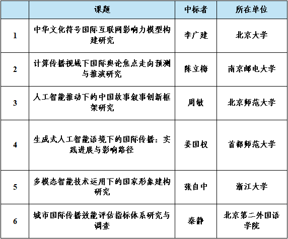 2025年中國外文局國際傳播研究課題招標(biāo)和評審工作已告一段落,按工作流程,現(xiàn)將國際傳播大數(shù)據(jù)智能實(shí)驗(yàn)室課題中標(biāo)結(jié)果公示如下: