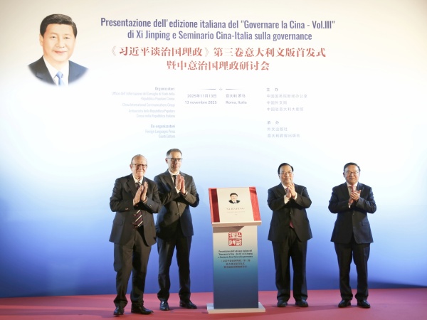 當(dāng)?shù)貢r間11月13日下午,由國務(wù)院新聞辦公室、中國外文局和中國駐意大利大使館主辦,外文出版社、意大利君提出版社承辦的《習(xí)近平談治國理政》第三卷意大利文版首發(fā)式暨中意治國理政研討會在意大利首都羅馬舉行。